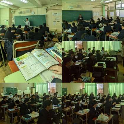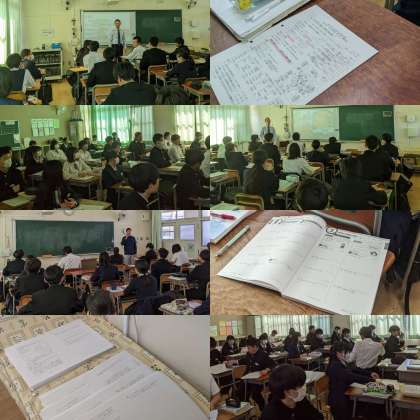 【体育】男子は成績のつけ方についての説明を聞いています。女子はスポーツの文化的意義について学んでいます。(3、4組)