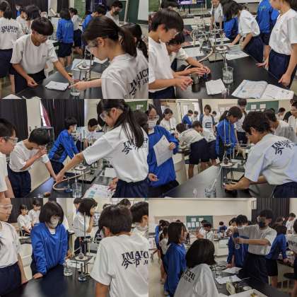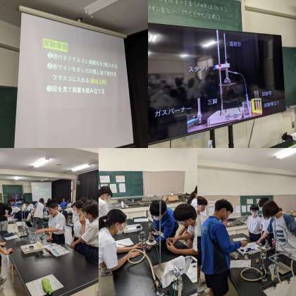 ワインの蒸留実験です。ガスバーナーを慎重に扱って火力の調整をしていました。
