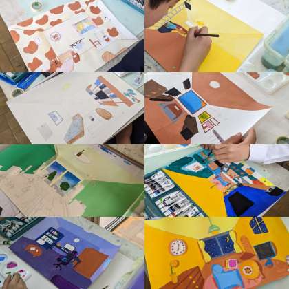 【美術】一点透視図法を使って、理想の自分の部屋を描いています。(4組)