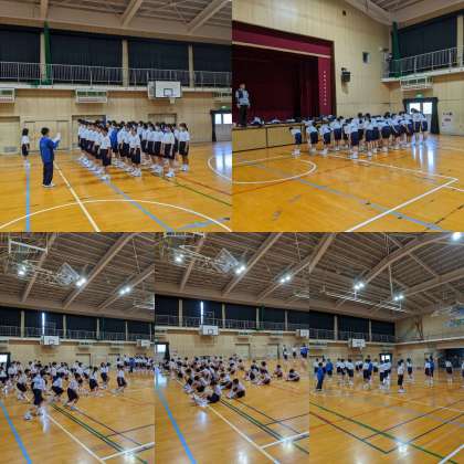 【体育】男女合同で、一泊移住で取り組む集団行動をしています。体育委員が指示を出してみんなが動き出します。(1、2組)