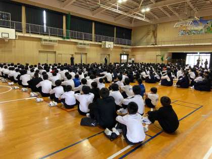 運動部、文化部が一同に体育館に集まり、部活動を行うにあたって、校長先生、生徒指導主事の先生の話を聞きました。