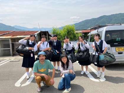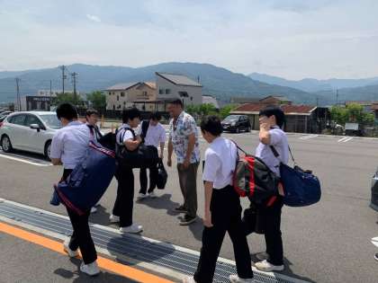 民泊体験を終えた生徒が、民家さんと退村式を行い、お別れの挨拶と記念写真を撮っています。