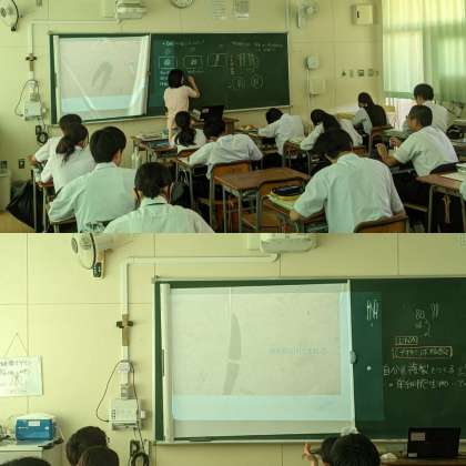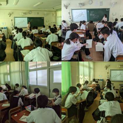 1時間目の授業の様子です。DNAについて学んでいます。普段意識していない所で、体の中では大切な働きが常におこなわれていることを知りました。核、DNA、染色体、遺伝子のそれぞれの説明をし合っています。(理科)