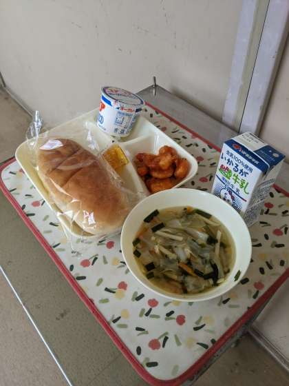 【本日の献立】 えびのチリソース 中華スープ ヨーグルト パン 牛乳
