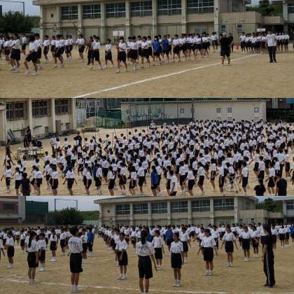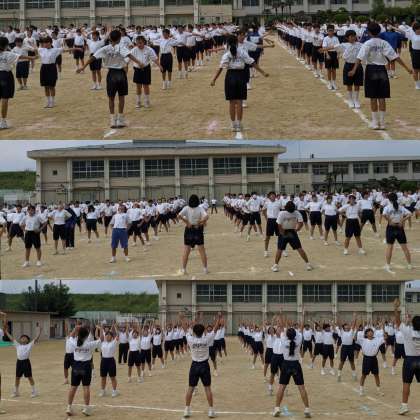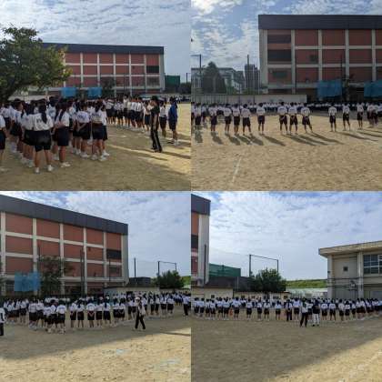 本日、5、6時間目に運動会の全体練習をおこないました。初めての全体練習です。行進の待機場所・開会式、閉会式の隊列などを確認しました。行進・体操体形・ラジオ体操の練習をおこないました。体育委員を中心にてきぱきと行動していました。最後は各団に分かれて校歌や応援の練習、自己紹介などをしていました。