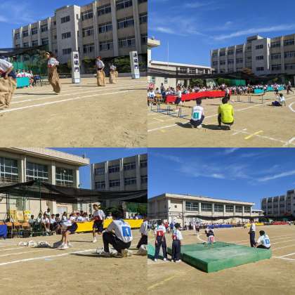 プログラム8番、バラエティ競争です。両足を麻の袋に入れて両足跳びで10m進みます。次に2台のハードルを飛び越えたあと、土嚢を15m運びます。さらに、マットで1回前回りをし、最後にネットをくぐりぬけて、一気にゴールを目指します。