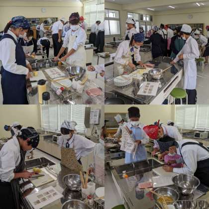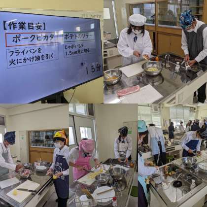家庭科の調理実習で、ポークピカタとポテトのソテーを調理しています。じゃがいもの皮をむいて切っていきます。おそるおそる包丁を使っていました。