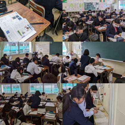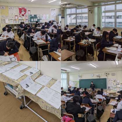 1時間目の授業の様子です。明日のテストに向けてそれぞれが学習しています。テストに向けてミスしやすい箇所の説明や、提出物の確認をおこなっています。学習しやすいようにプリントも準備されていて、テストに向けて前向きに取り組んでいました。