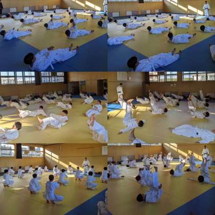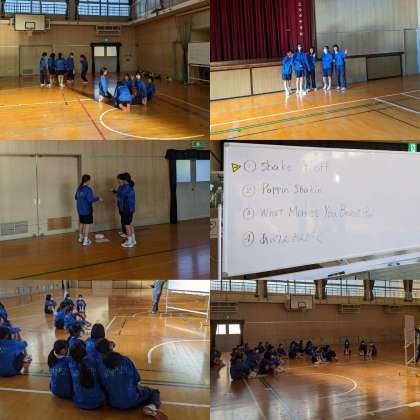 【体育】男子は武道場で柔道をしています。しっかり受け身を取れるように練習をしています。女子は体育館で創作ダンスをしています。4曲の中から選んで、振り付けを考えます。(1、2組)