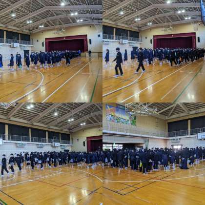 本日、始業式がおこなわれました。式が始まる前に集合の様子を見ての話がありました。3年生の姿を見て2年生が、その姿を見て1年生が集合の形を作ることができています。先生がマイクを使わなくても聞こえる静かな空間を作ることができています。3学期は集会が終わって教室に戻るときに静かに行動できるようにしましょう。