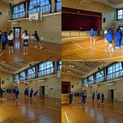 【体育】男子は運動場で12分間走、女子はアルティメットのスローイング練習をしています。(1、2組)