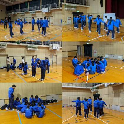 【体育】ダンスの講師に教えていただいた振り付けを練習しています。基本のダンスに自分たちで創作した振り付けも追加して発表します。(1、2組)