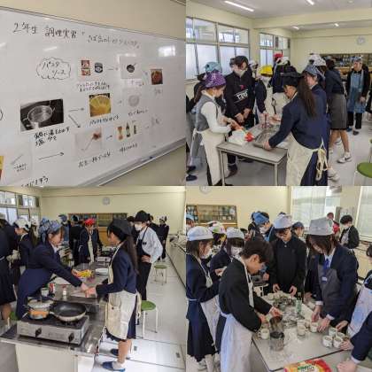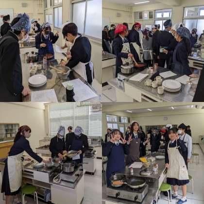 4時間目の授業の様子です。調理実習をしています。班で協力して『さば缶のトマトソースパスタ』を調理します。