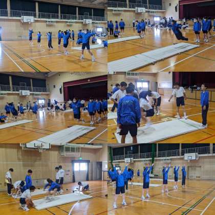【体育】女子はラジオ体操のテストと立ち幅跳びの練習をしています。男子は立ち幅跳びの測定です。(1、2組)