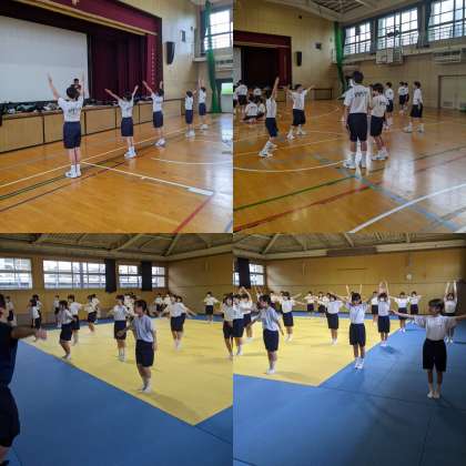 【体育】男女ともに、ラジオ体操のテストに向けて、動きの確認をしています。(2、4組)