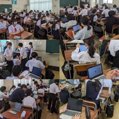 5時間目の授業の様子です。一人一台パソコンの設定をしています。100台以上のパソコンを一斉に起動させるので、中々初期設定が進まず苦労していました。