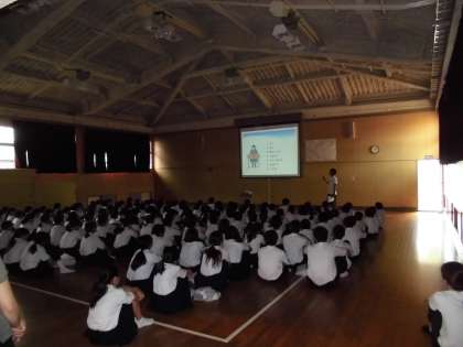 5時間目に全員が武道場で視聴覚教材を使って学習し、(上の写真参照)、6時間目に各クラスでプリントを使って学習しました。