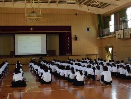 6日(水)、3年生は「性感染症の予防のおはなし 中学生のあなたへ」というテーマで、旭区保健福祉センターの保健師の方から講話をしていただきました。体育館でパワーポイントやDVDもまじえて話をしていただきました。
