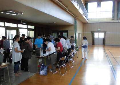 9月4日(日)に地域の防災訓練がありました。一時避難所である公園に集合したのち、避難場所に指定されている、本校の体育館に移動されました。上の写真は体育館の入り口で参加者名簿の確認などを行っているところです。