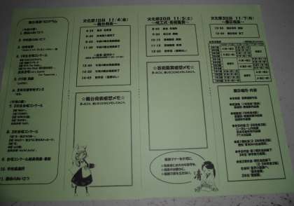 舞台発表のプログラムのほか、11月4日、5日、7日の時程、合唱コンクールの曲名や生徒の役割などを紹介しています。