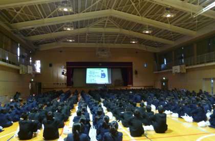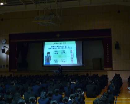 21日(水)の1時間目に、体育館で全校生徒を対象に「ケータイ安全教室」を開きました。外部から講師の方にご来校いただき、話をしていただきました。