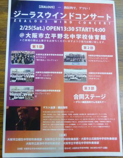 第1部は高津中学校、瓜破西中学校、相生中学校が演奏します。第2部は平野北中学校と本校が演奏します。本校は「Ters of moon」「J-POP冬うた」を演奏する予定です。