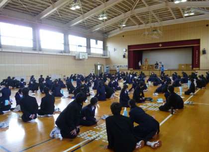 8日の5・6時間目に体育館で1年生の百人一首大会を行いました。この日のために、歌を一生懸命に覚えて大会に臨んでいます。各クラス1名づつで、グループをつくって試合を行いました。