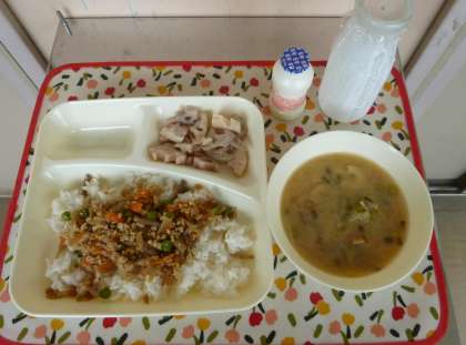 鶏ごぼうごはん みそ汁 焼きれんこん はっ酵乳