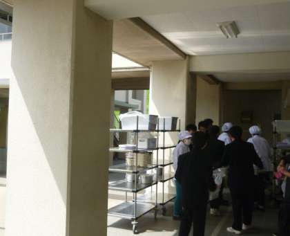 下の写真は、食べ終わったあと、食器等を配膳室へ当番の生徒が返却しているところです。