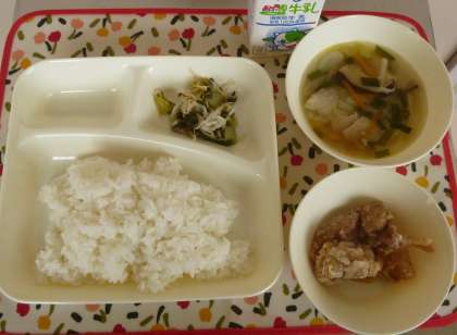 チンゲンサイともやしの甘酢あえ ごはん 牛乳