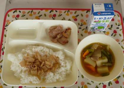 かつおぶしは、本日のごまかかいための他に、給食では、だしをとる、あひたしにかける、粉のかつおぶしを生地にまぜて焼く、などに使われています。