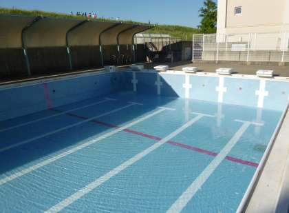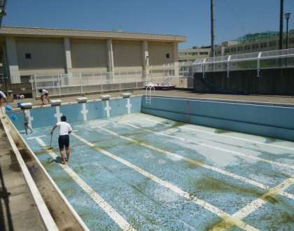 水泳部の生徒は、午後約2時間かけてプールの清掃をしました(上の写真)。清掃後、きれいになったプールに水を入れています(下の写真)。あすからプールでの練習を開始します。