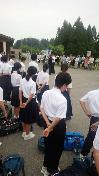 修学旅行1日目は、富山県立山での民泊体験、まずは入村式。しっかりお話を聞いています。