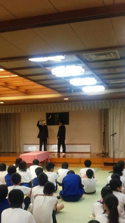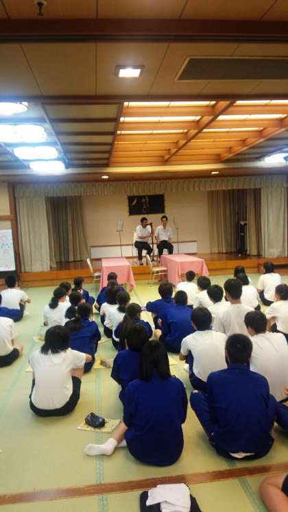 高山散策も無事に終わりホテル到着。夕食と入浴を済ませレクリエーション大会です。最後のパフォーマンスに先生の漫才も飛び入り参加です。