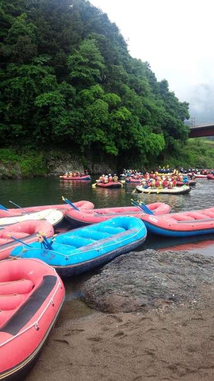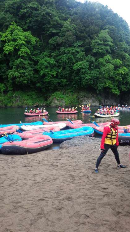さぁ、ラフティングの始まりです。天候は曇り時々小雨です。ちょっと水は冷たいかなぁ?