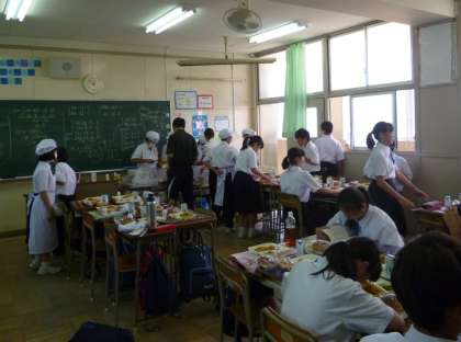 下の写真は2年生の配膳のようすです。当番の生徒が運搬、配膳、後片付けを担当しています。