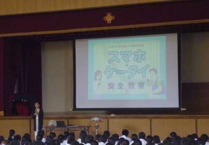 19日の1時間目に体育館で全校生徒を対象に「スマホ ケータイ 安全教室」を開きました(上の写真)。