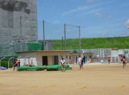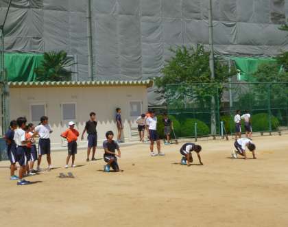 上の写真は陸上部の練習のようすです。この日は十三中学校との合同練習でした。