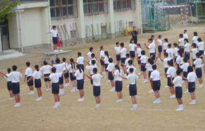 前回につづいて、行進の練習(上の写真)とラジオ体操(第2)の練習(下の写真)を行いました。行進は前回よりもうまくできたようです。