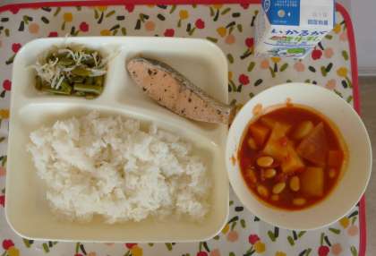 本日は、学校給食献立コンクールの優秀賞作品です。魚、大豆、野菜を使った洋風の健康メニューを考えたということです。