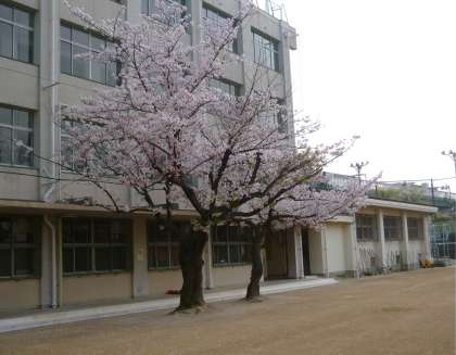 写真は、4月1日の技術室前の桜のようすです。満開から少し散り始めた状態ですがまだまだ美しく咲いています。