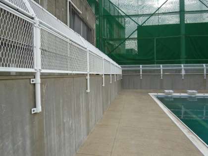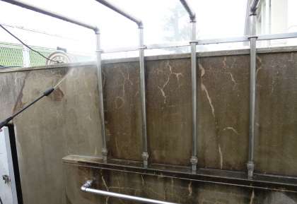 水泳部の生徒がプールの掃除をしています。器具も使って、プールサイドや壁などをきれいにしています。下の写真の右側が掃除まえ、左側の部分が掃除後です。長い間掃除をしていなかったところですが、きれいになりました。
