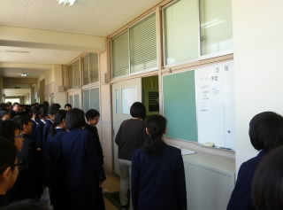 2時間目は、学級ごとに校内の見学をしました。特別教室の位置などを確認しました。下の写真は職員室前で、教室の鍵や学級日誌の位置を確認したりしているところです。