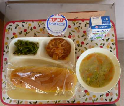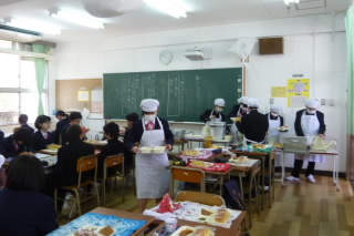 上の写真は1年生の配膳のようすです。当番の生徒が盛り付けをして、運んでいます。小学校でも経験していることもある、スムースに進んでいます。