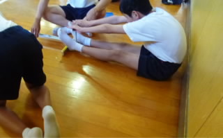 武道場では、長座位前屈の測定をしました(上の写真)。また、南館校舎の廊下で、左右の握力を測りました(下の写真)