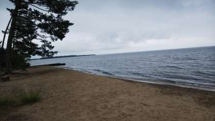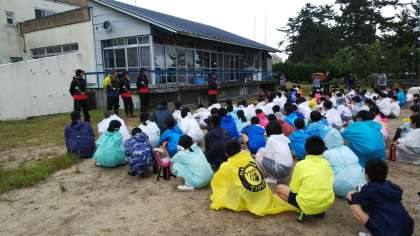 砂浜で、リーダーの方から説明を聞いています。90分交代で、前半は、1組と2組がカッター訓練、3組と4組が体育館で室内オリンピック、後半はその逆です。