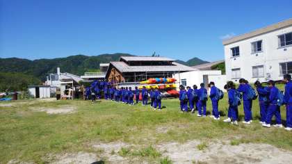 朝食のあと、来た時よりも美しくをモットーに部屋などの掃除をしました。これから、野外炊飯をします。写真は、炊飯城に向かうところです。