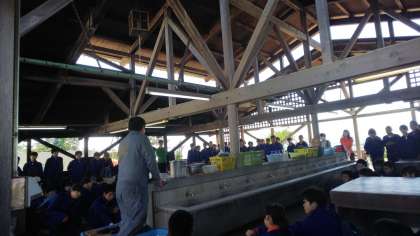 野外炊飯を前にリーダーの方からの説明です。米もカレーも水の量がポイントです。