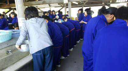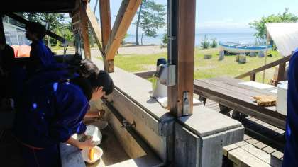 各班で係を決めて、米をといだり、野菜を切ったりしています。