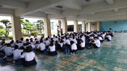 小雨まじりの天候ですが、平和学習は予定通りに出発しました。